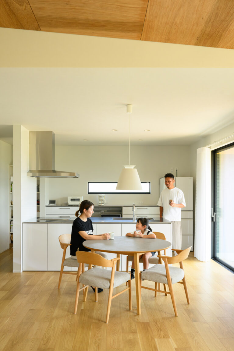 白いアイランドキッチンは、EIDAIの『ラフィーナ ネオ』を採用。ダイニングテーブルと対面したキッチンを採用することで、家族の会話が弾みます。また、テーブルは円形にしたとこで、家族の距離が縮まりました。