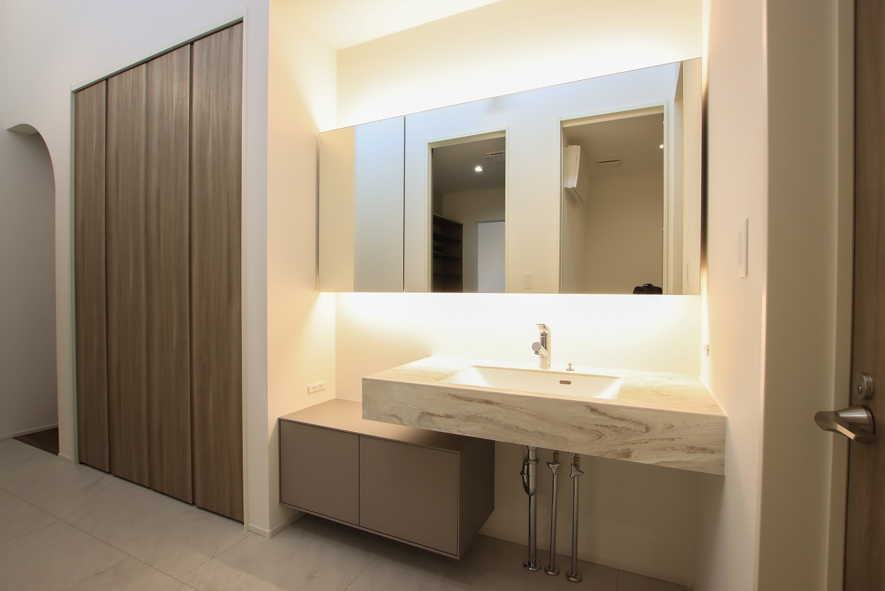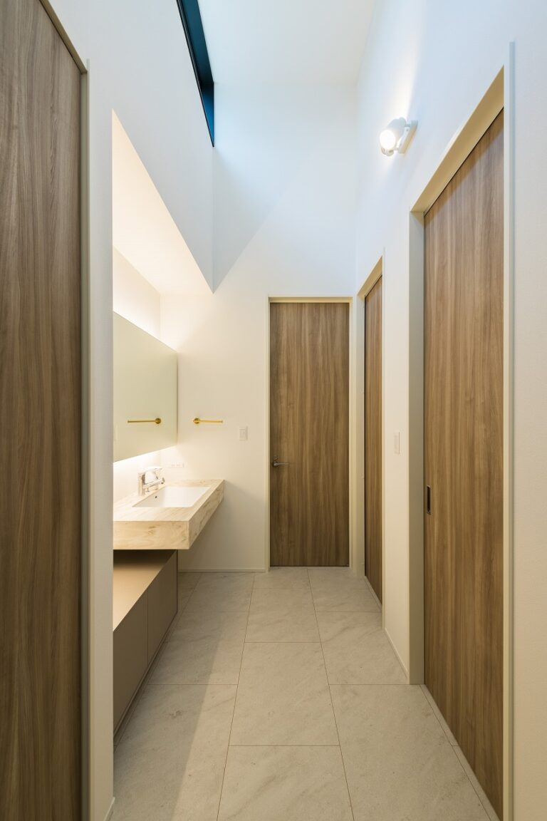 吹抜けからの外光がやさしく差し込む廊下の一角に設けた洗面スペース。天然石のような風合いが魅力のクォーツストーンのカウンターは、ラグジュアリーな佇まいに加え、高い耐久性も兼ね備えています。
