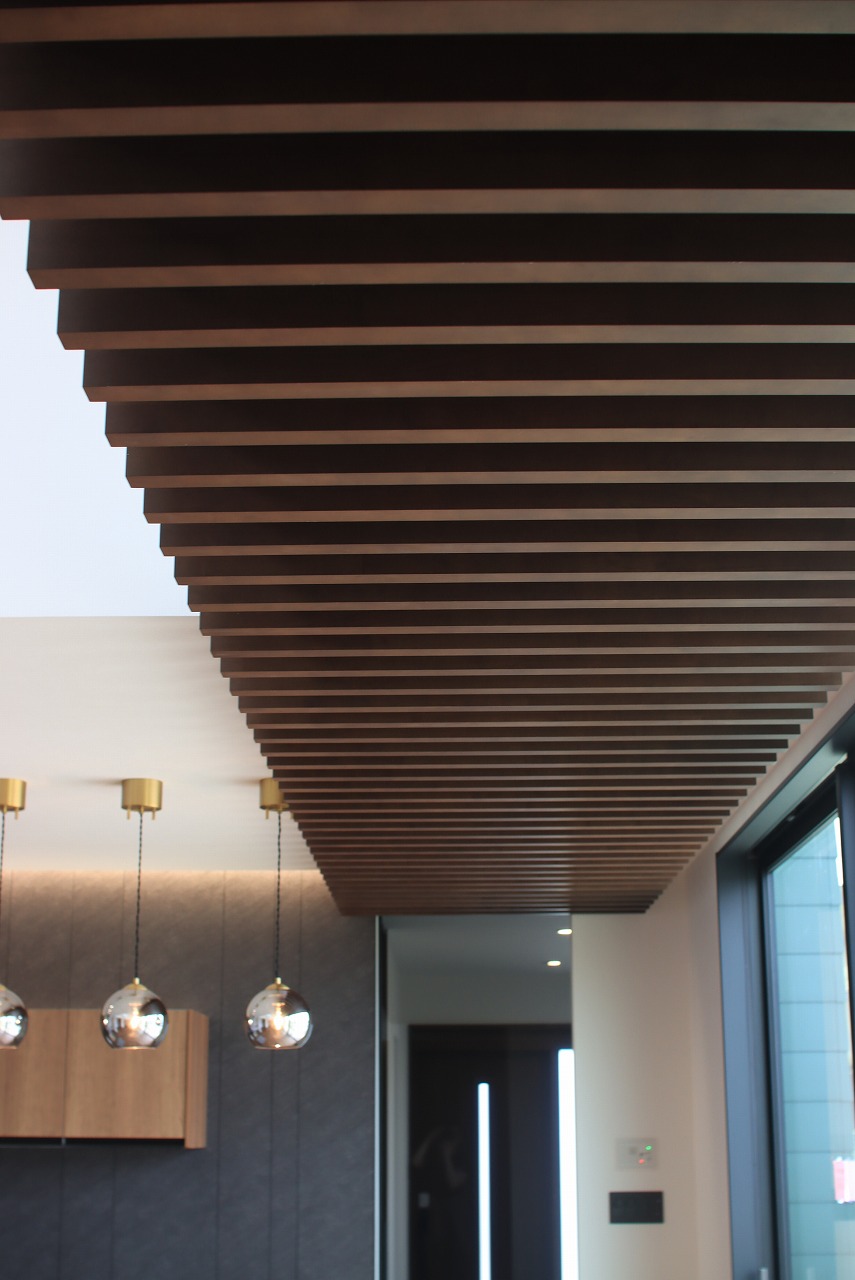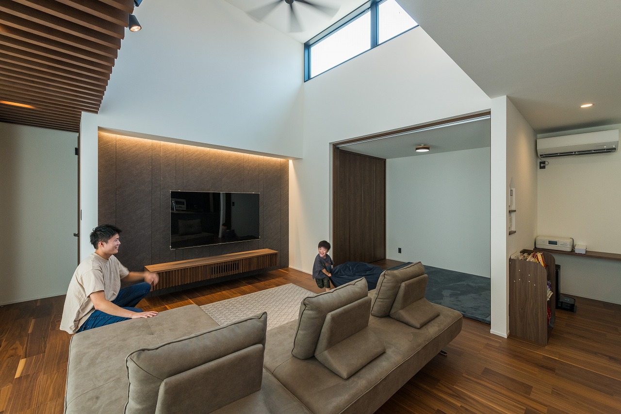 ホテルのような上質さを感じさせるLDK。人目を気にせずくつろげる北側には、ルーバー天井を設えた大きな開口部を設け、日常を離れた特別な時間を演出しています。さらに、開放感あふれる吹抜けと高窓を取り入れたリビングも、この空間ならではの大きな魅力です。