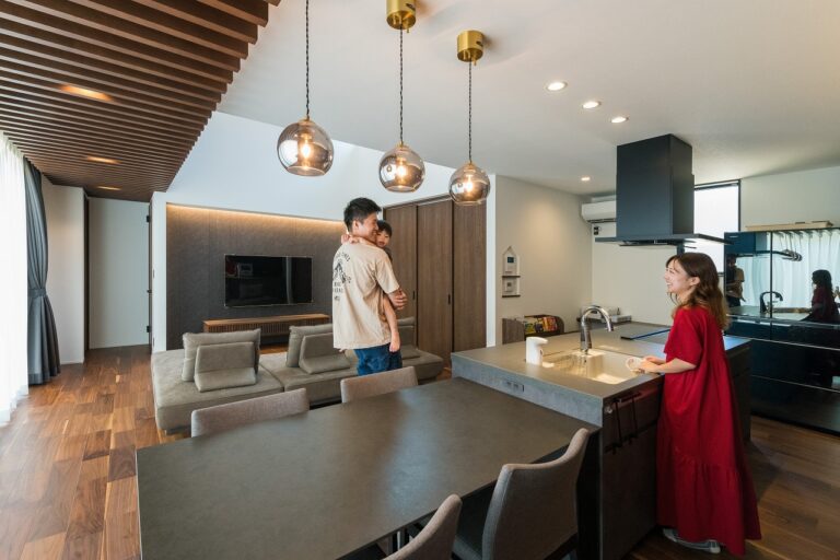 高校時代からの友人であるH様ご夫妻と設計担当者。気心の知れた関係だからこそ、「平屋」と「広いLDK」という大枠の希望のみを伝え、住まいづくりは基本的に一任されたそう。玄関からLDKへ向かう動線と、水廻りへつながる動線を分けるなど、日々の使いやすさにも配慮したプランは見どころのひとつです。