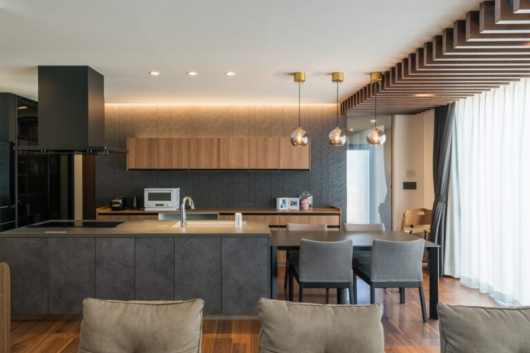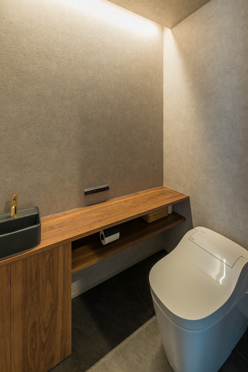 スタイリッシュな印象を感じさせるキッチンには、Panasonicの『Lクラス』を採用。カップボード背面にはアイカ工業の『セラールセレント』をあしらい、間接照明を組み合わせることで、上質感のある洗練された空間に仕上げています。