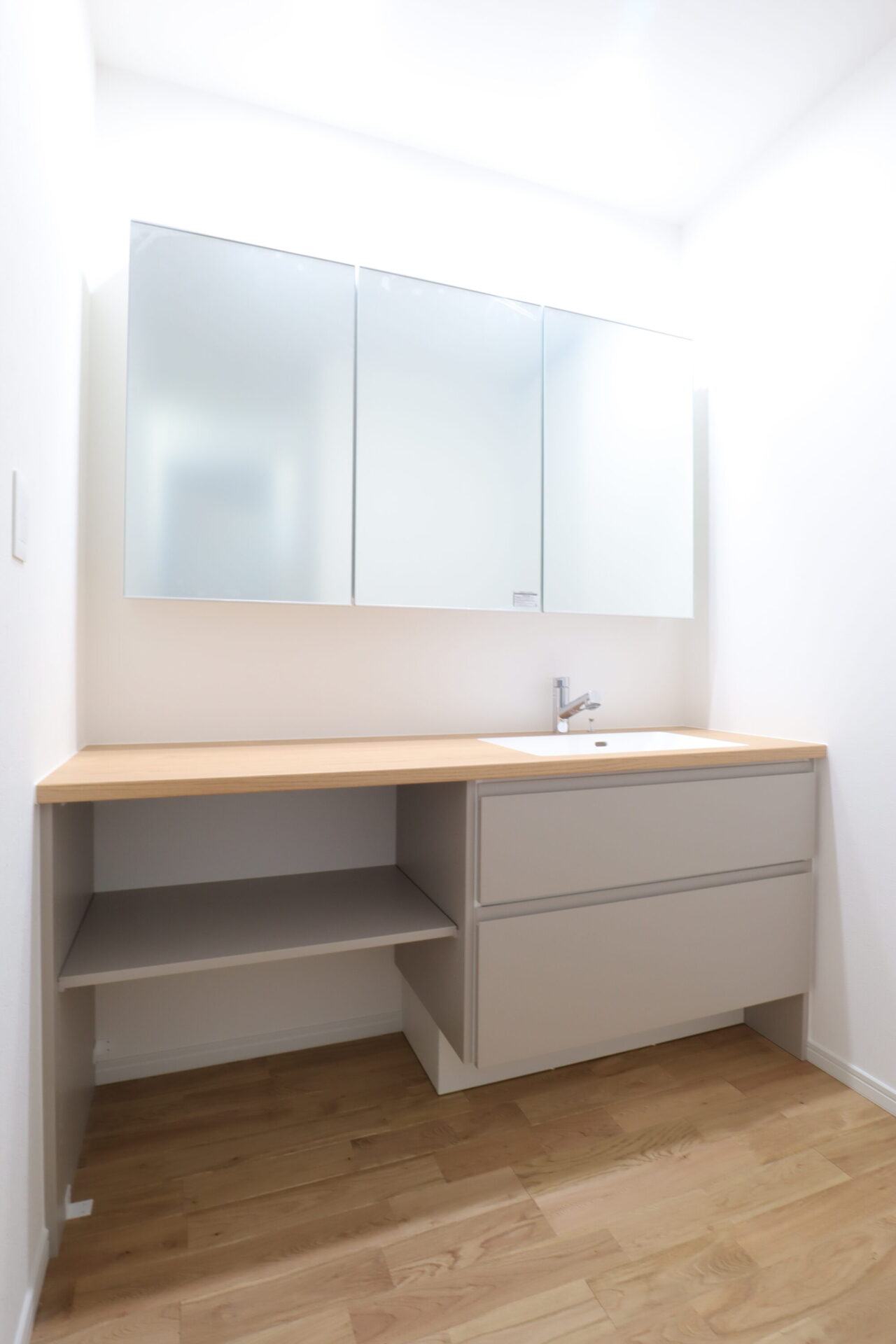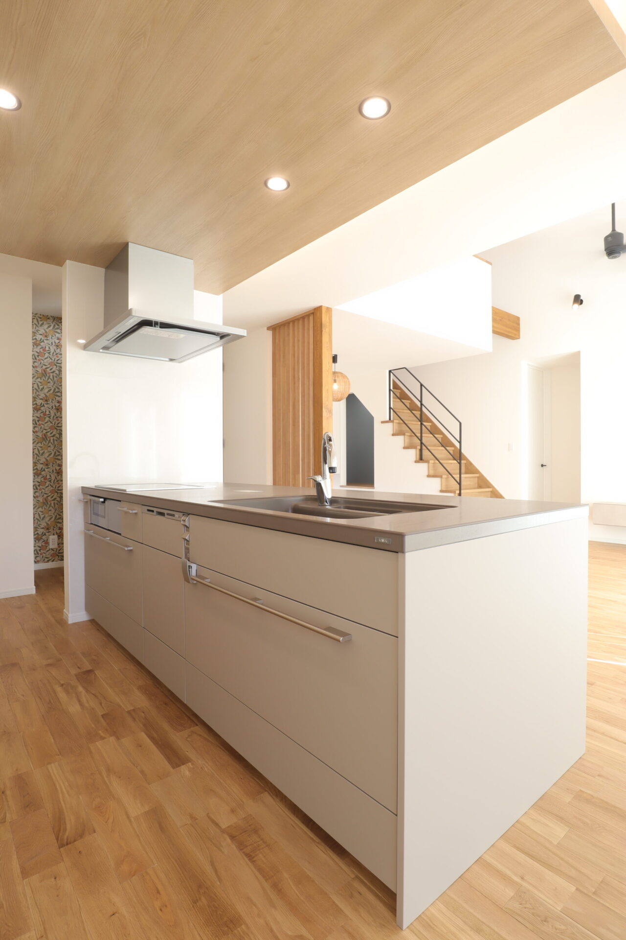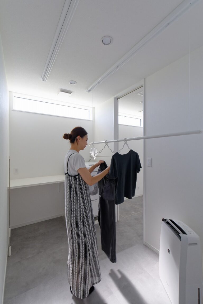 キッチンの裏動線には、脱衣室・ランドリールーム・ファミリークローゼットをつなげた効率的な洗濯動線を計画しました。独立したランドリールームには、昇降式の物干し竿「ホスクリーン」を設置し、アイロンがけに便利なカウンターも備えることで、洗濯から収納までをスムーズに行える空間としています。
