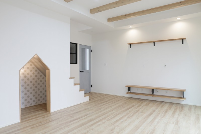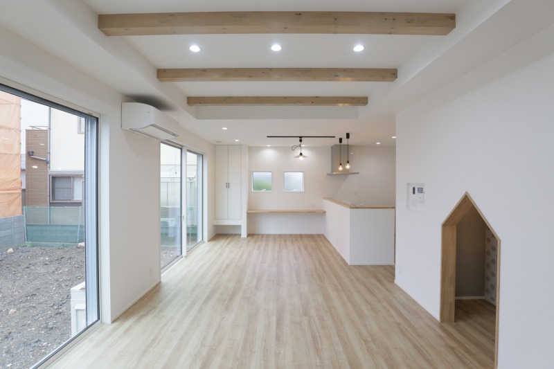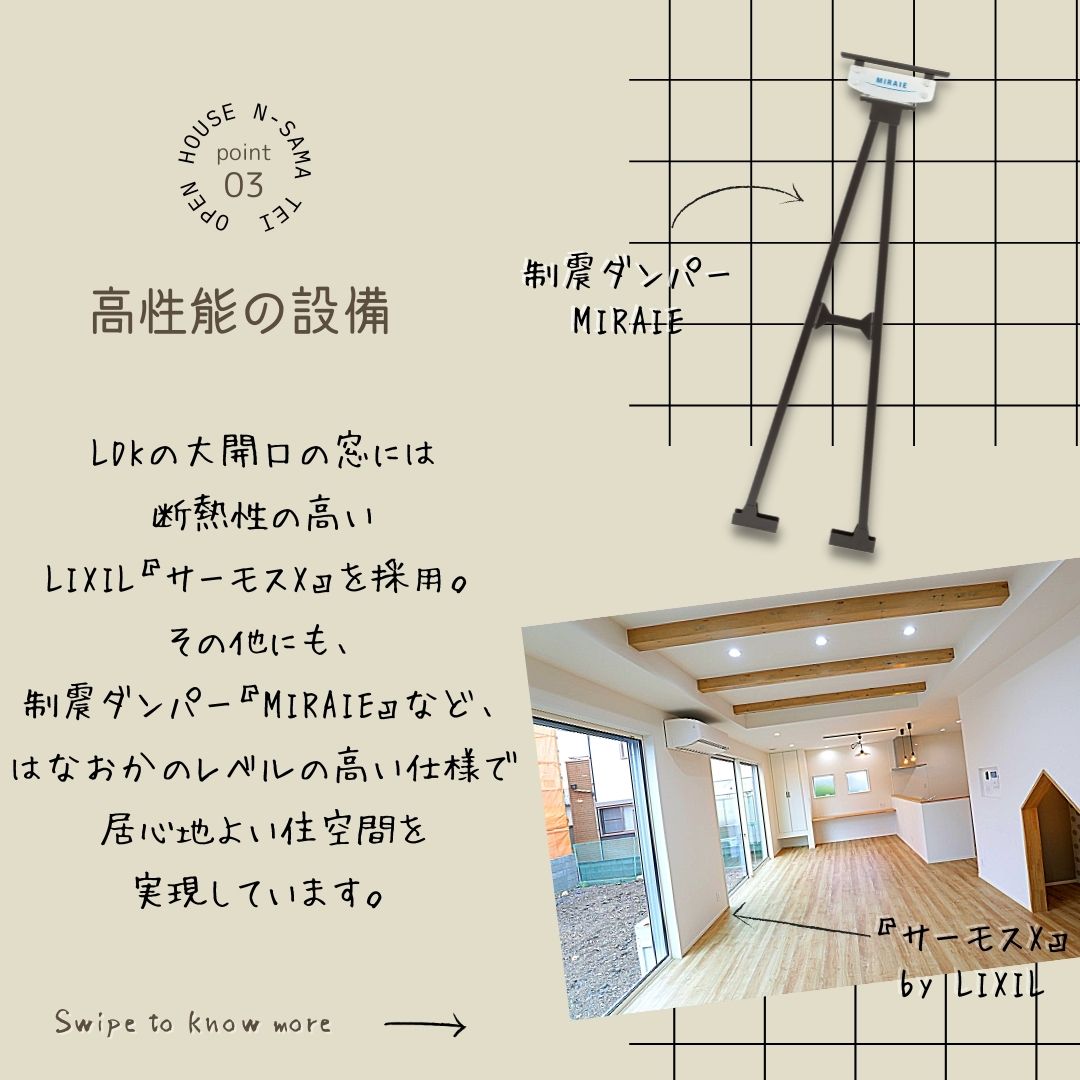 淡い色味をつかったナチュラルな内装や、ハンモックやプロジェクターなども設置するなどお家時間を楽しく過ごせるアイデアも詰まっています。また、生活動線を考慮した間取りや高性能の設備にもこだわりました。デザインと間取り、性能の三つの要素が揃った住まいをこの機会にぜひ、ご覧ください。