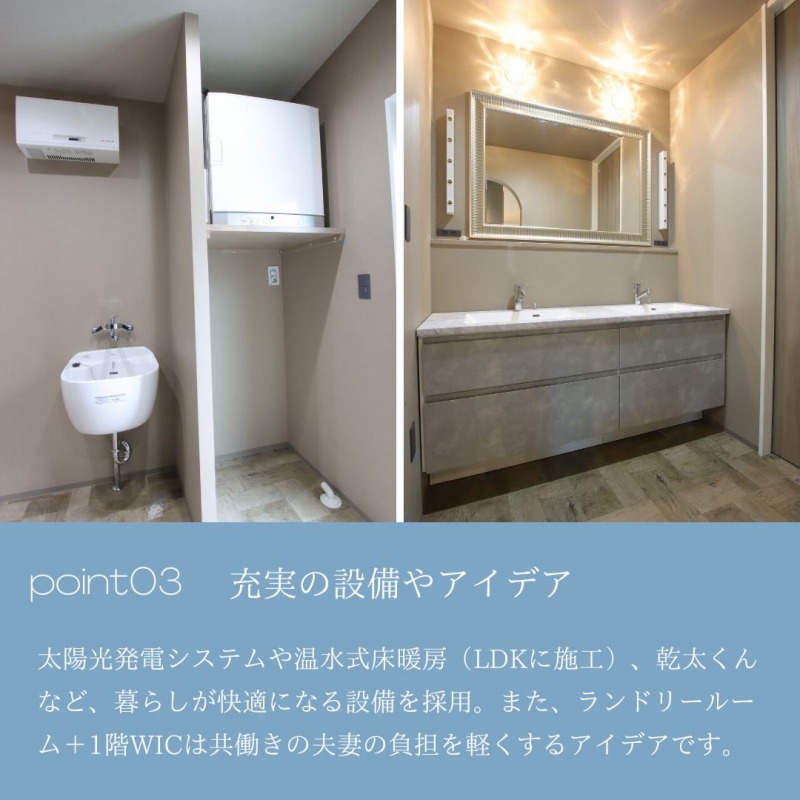 太陽光発電システムや温水式床暖房(LDKに施工)、乾太くんなど、暮らしが快適になる設備を採用。また、ランドリールーム+1階WICは共働きの夫妻の負担を軽くするアイデアです。