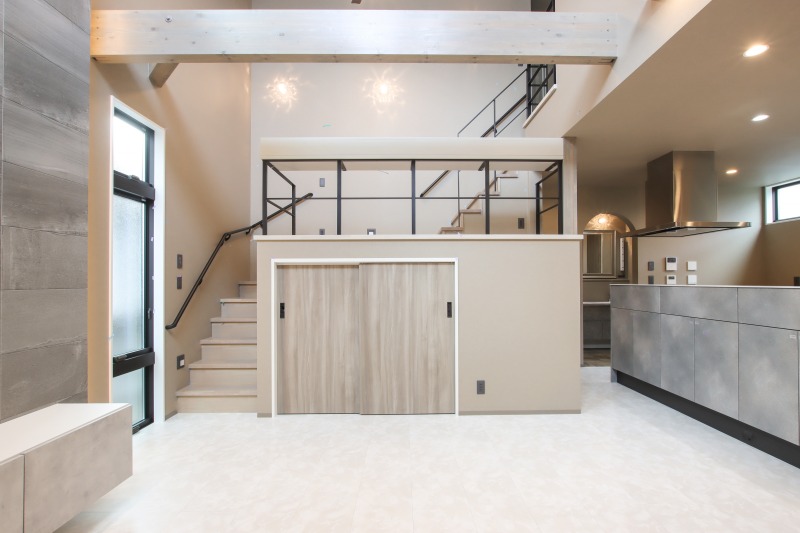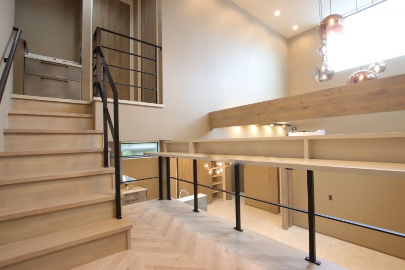 住居スペースは二階建てで、リビング上部に吹抜けを造っています。階段途中にスキップフロアを配置し、リビングを見下ろしながらお子様の勉強やリモートワークスペースとして利用できます。