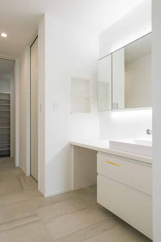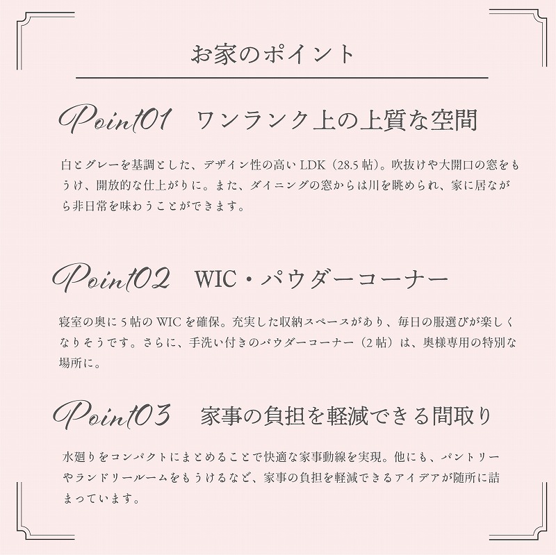 寝室の奥に5帖のWICを確保。充実した収納スペースがあり、毎日の服選びが楽しくなりそうです。さらに、手洗い付きのパウダーコーナー(2帖)は、奥様専用の特別な場所に。