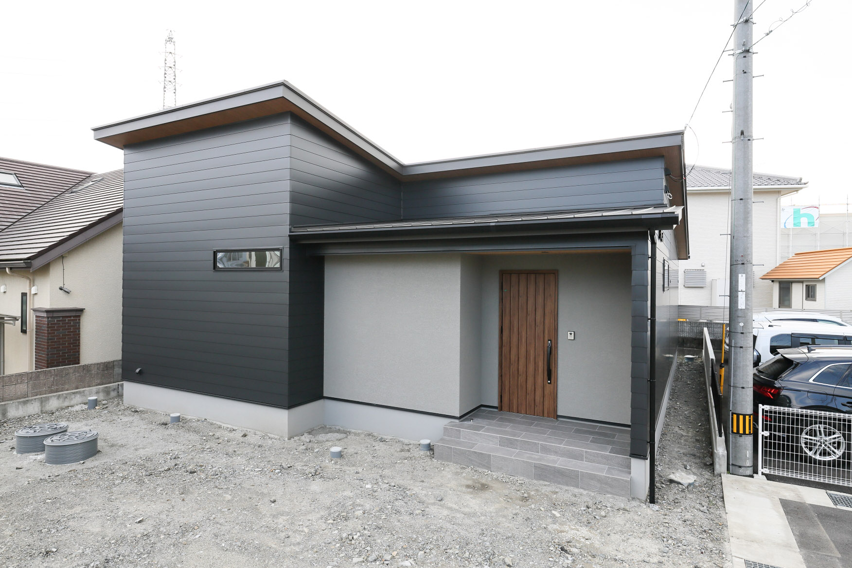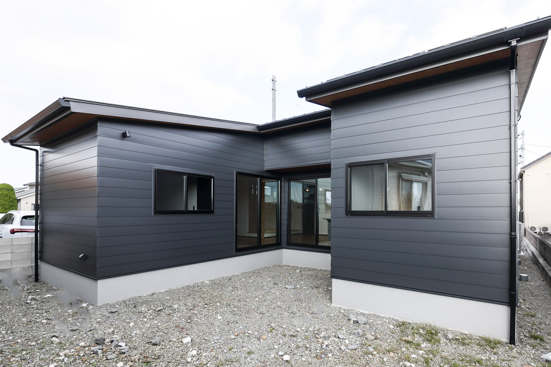 ガルバリウムや杉、塗り壁の異なる3つの素材でコーディネート。シックな色合いで統一した意匠性の高い外観になっています。