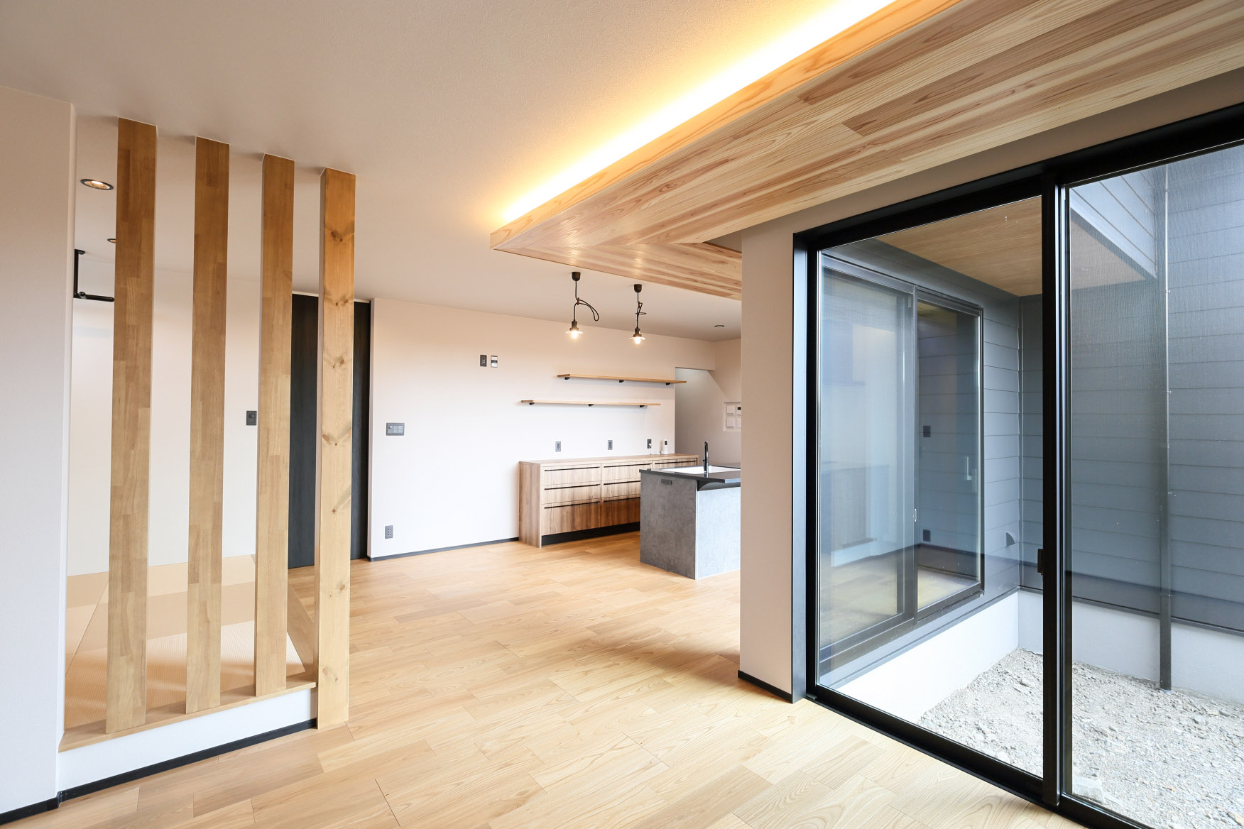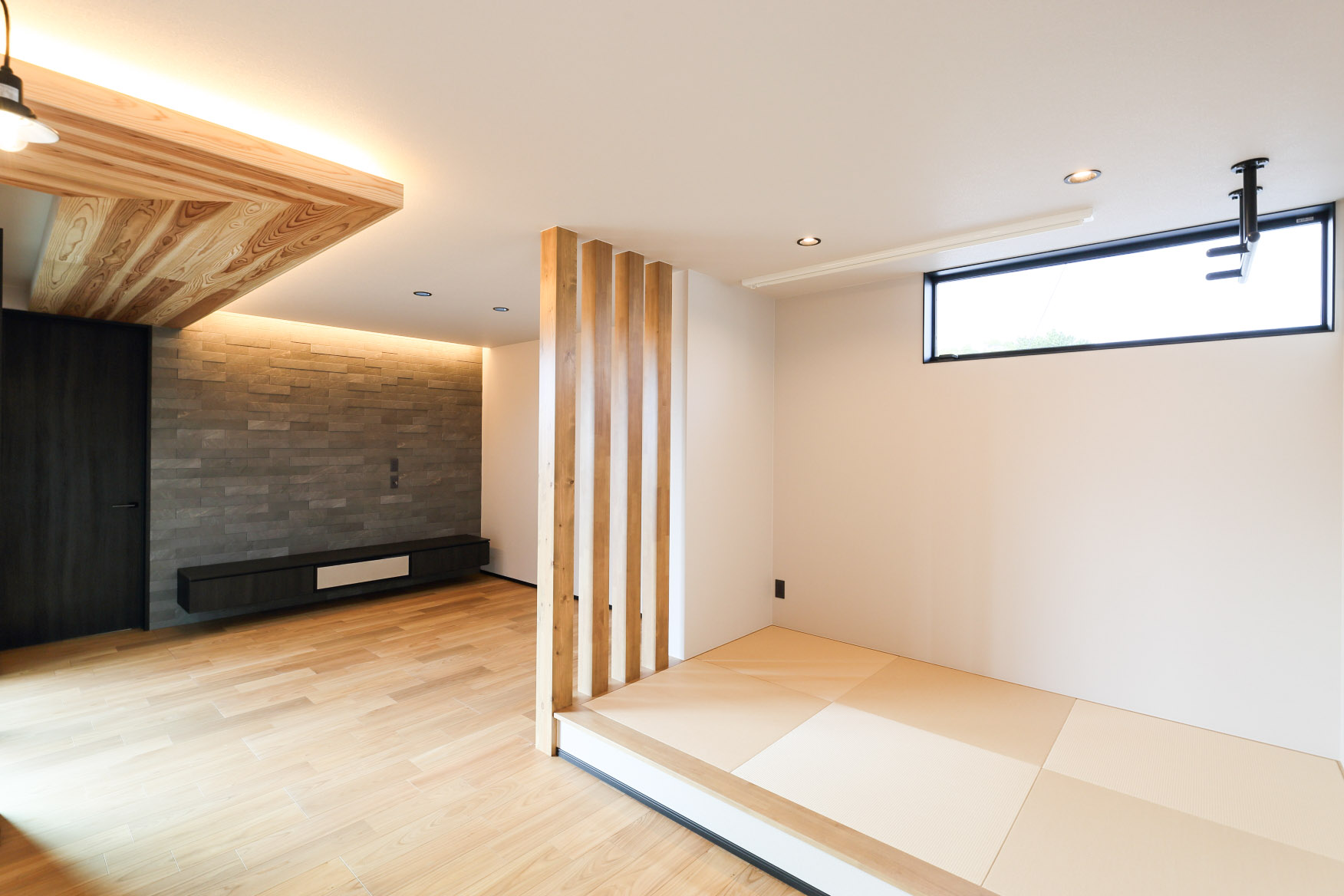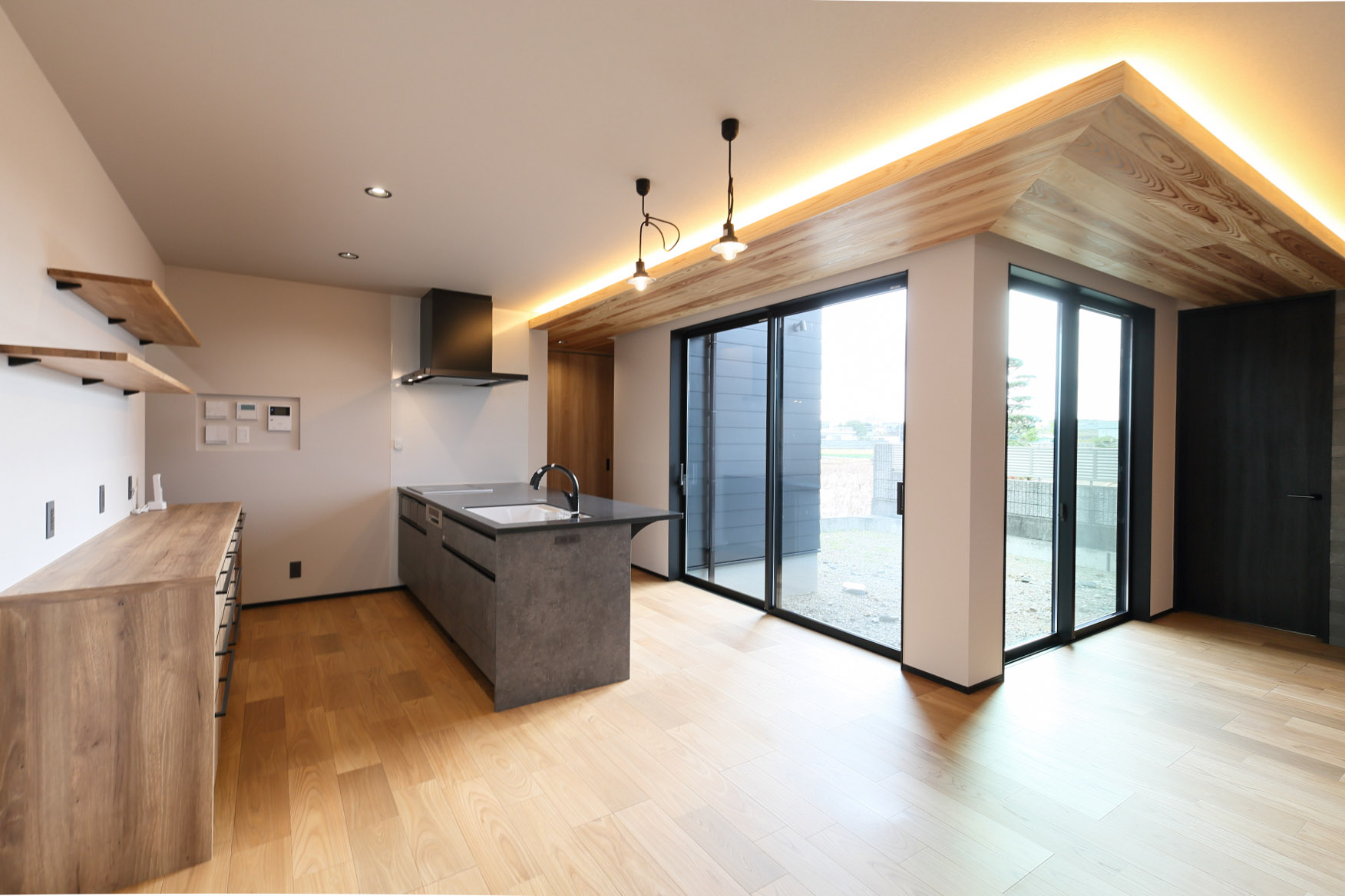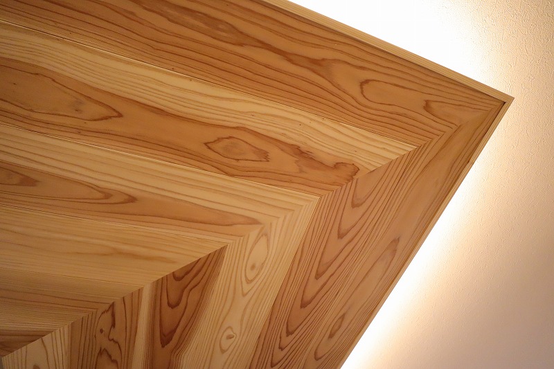 L字型に配した下げ天井は杉板、テレビ背面にはエコカラットを採用。また、二面の掃き出し窓を設け、採光が確保できるように。