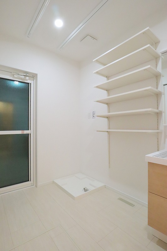 ランドリールーム兼洗面脱衣室スペース(3帖)は、勝手口から物干しスペースへ直行! さらに、ファミリークローゼットが近いので、洗濯物が乾いた後もすぐに片付けられます。