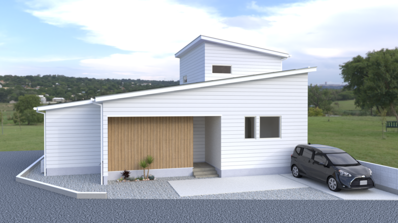 横貼りに施工した白のガルバリウムと木目調のサイディングがアクセント。スタイリッシュな仕上がりに。