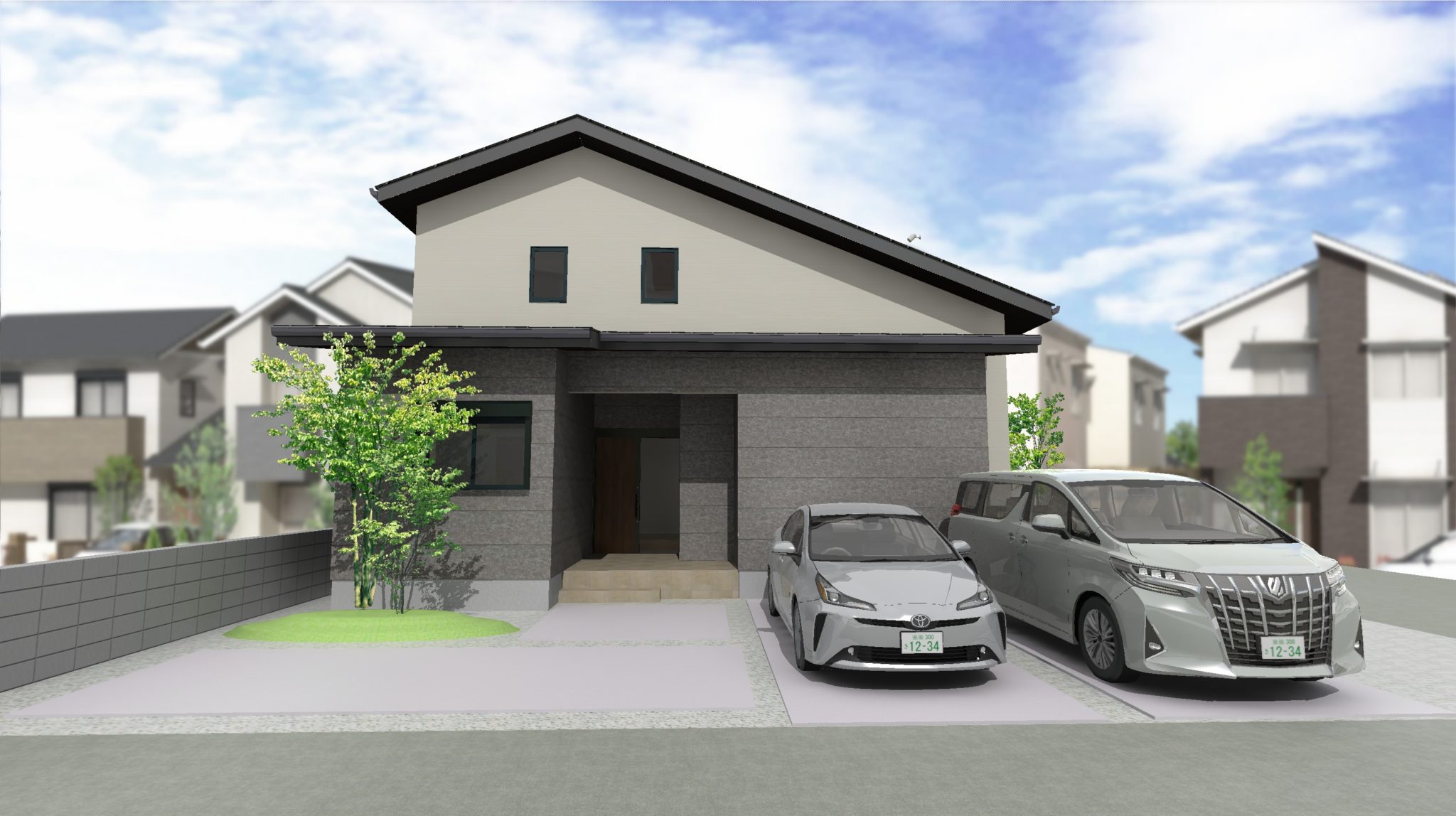 家全体を包み込むような大屋根が印象的な外観。白とグレーの外壁材を張り分け、モダンで重厚感のある佇まいに仕上げました。