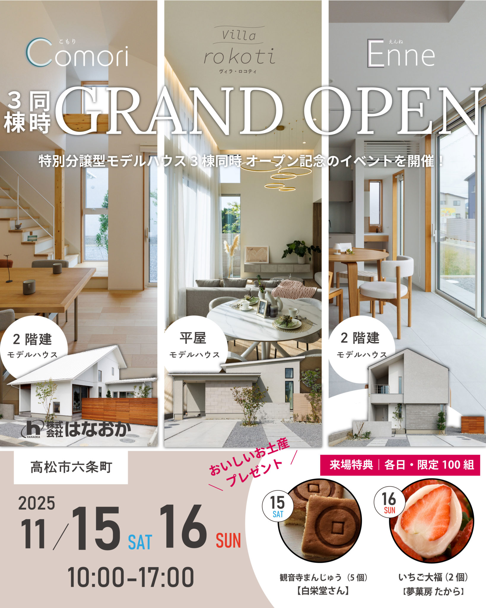 11月15日(土)・16日(日)、高松市六条町にて、新平屋モデルハウス&2階建てモデルハウス2棟のオープンイベントを開催します!