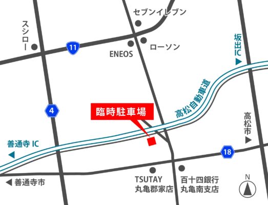 ・臨時駐車場:丸亀市郡家町(JA香川 丸亀支店社員駐車場)※臨時駐車場から車で送迎いたします。