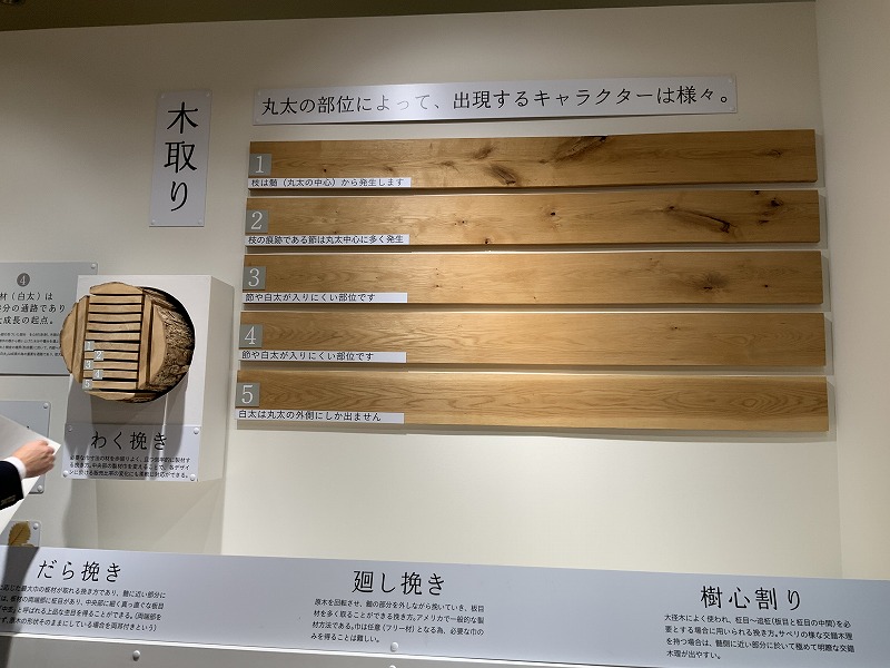 丸太から木材をとる場所によって、木目出方がこれだけ変わってきます。皆様の好みは何番ですか?!