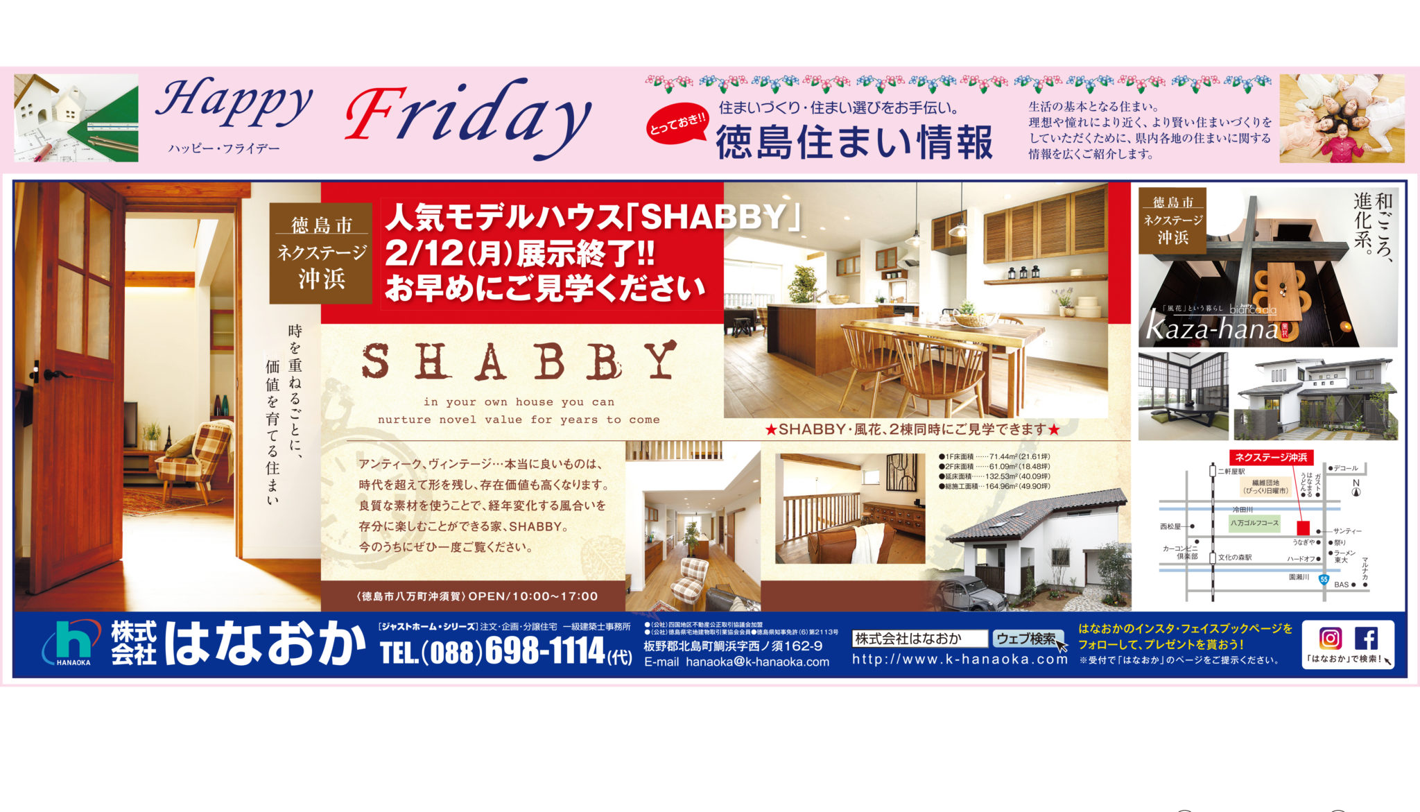 本日の新聞広告「SHABBY」2/12(月)に展示終了 2018.01.26 人気モデルハウス「SHABBY」が2/12に展示が終了致します。 まだご覧になられていない方、もう一度見てみたい方はお早めにご見学下さい。 また、同じ沖浜モデルハウス「風花」、北島モデルハウス「ハレ」、「i-works」もいつでもご見学頂けますので ご興味のある方はお気軽にご連絡下さい。 share 前の記事へ 次の記事へ 一覧へもどる