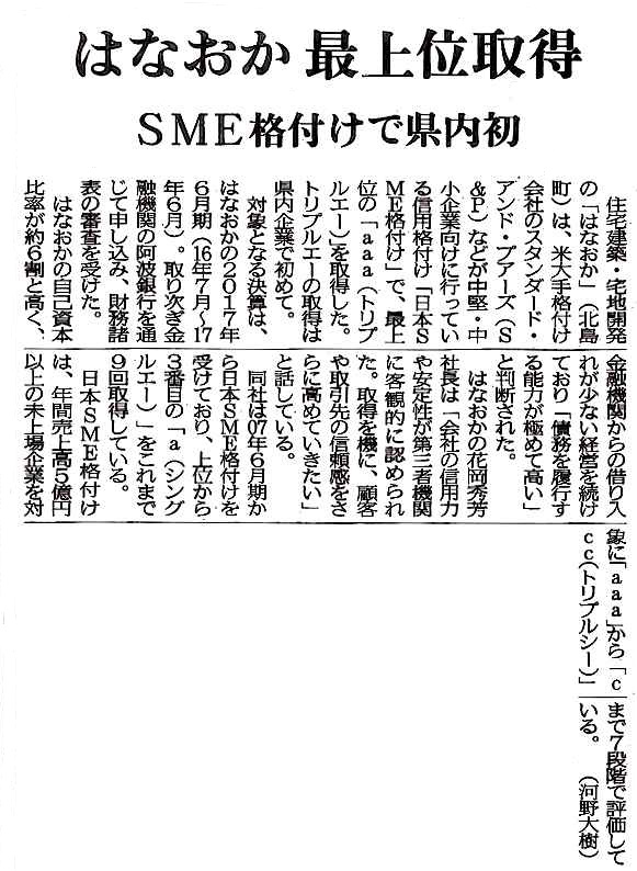 3月17日付け『徳島新聞』掲載『はなおか最上位取得 SME格付けで県内初』
