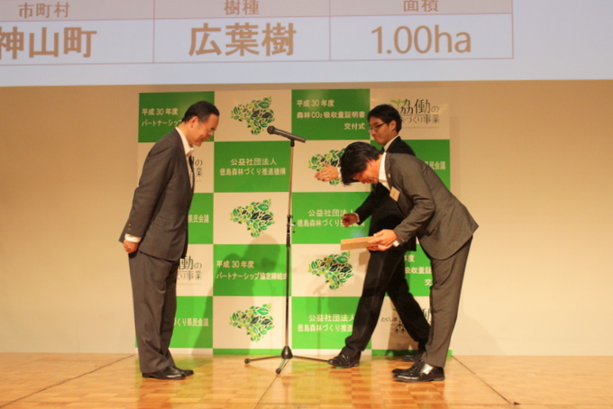 弊社は平成24年度(平成25年2月調印)から参加しており、今回は神山町の森1haで年間4.04tを吸収量として証明書を発行していただきました!
