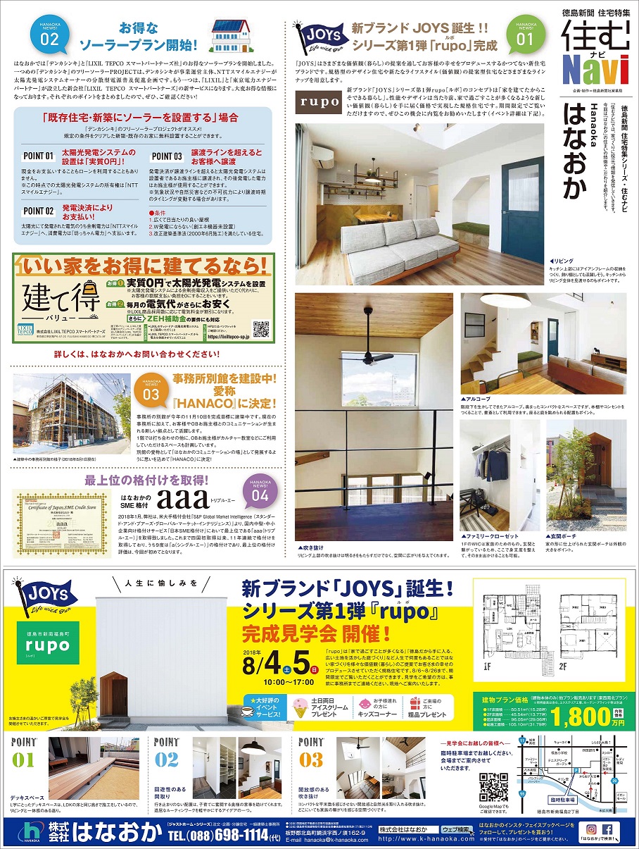 8月4日付けの『徳島新聞』に広告が掲載されます 2018.08.03 8月4日付けの『徳島新聞』に広告が掲載されます。 お得なソーラープランや明日にオープンする『rupo』について掲載していrます。 ぜひ、ご覧ください。 見学会の詳しい内容はコチラ!!! share 前の記事へ 次の記事へ 一覧へもどる