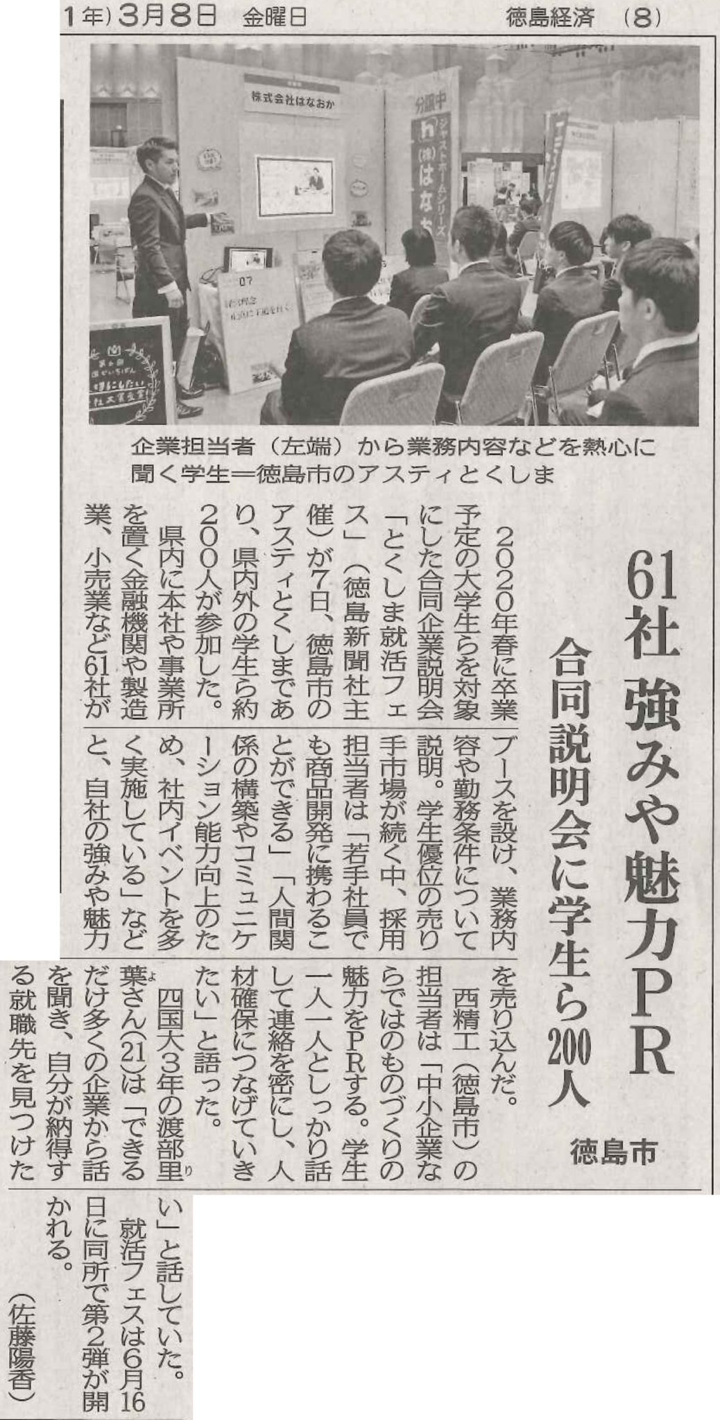 3月7日(木)にアスティとくしまで開催された「とくしま就活フェス」の記事が徳島新聞に掲載され、はなおかブースの写真が掲載されました。