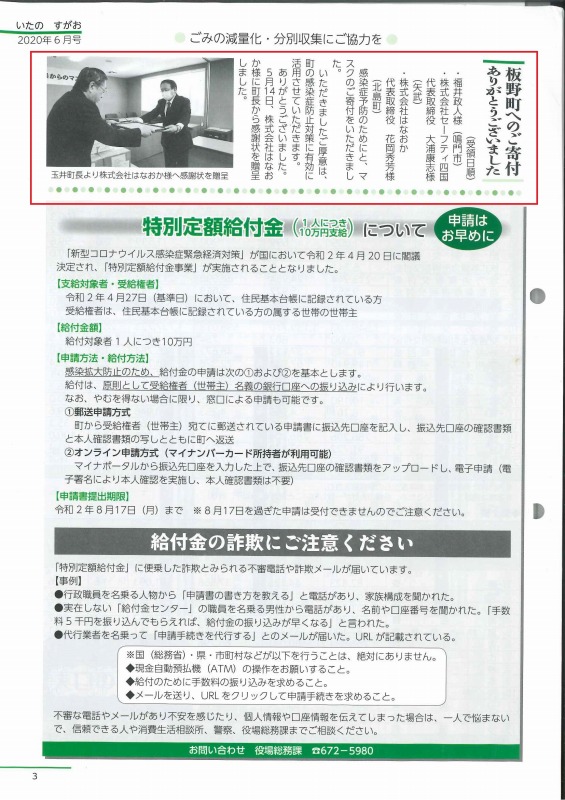 『広報 あいずみ』6月号、広報『いたの すがお』6月号、『町報 きたじま』6月号に、5月14日(木)にマスク各10000枚を各町役場で寄付した様子が掲載されておりました。