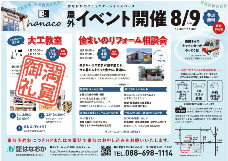 8月9日(日)開催、大工教室受付締め切りらせていただきました!
