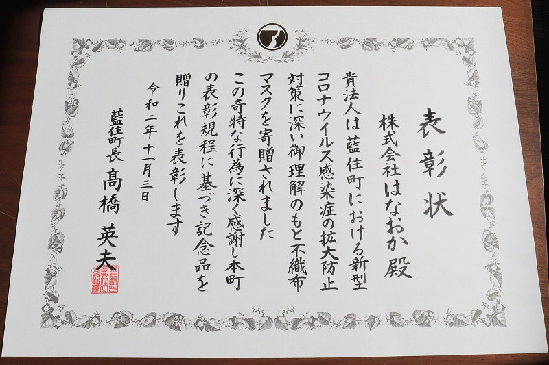 新型コロナウイルス感染症の影響でマスクの品薄が続いていた今年5月、当社で新築して下さったOB様や板野郡の各役場などにマスクを郵送し、藍住町役場にはマスク1万枚を寄贈させていただきました。