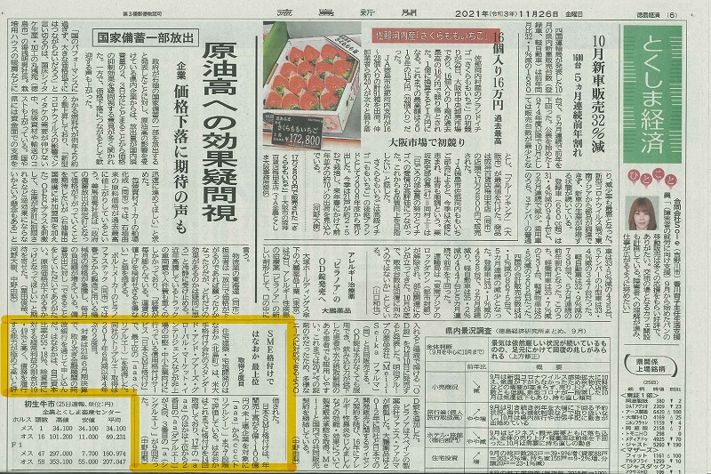 11月26日(金)付けの徳島新聞に、はなおかのSME格付け取得に関する記事が掲載されています。