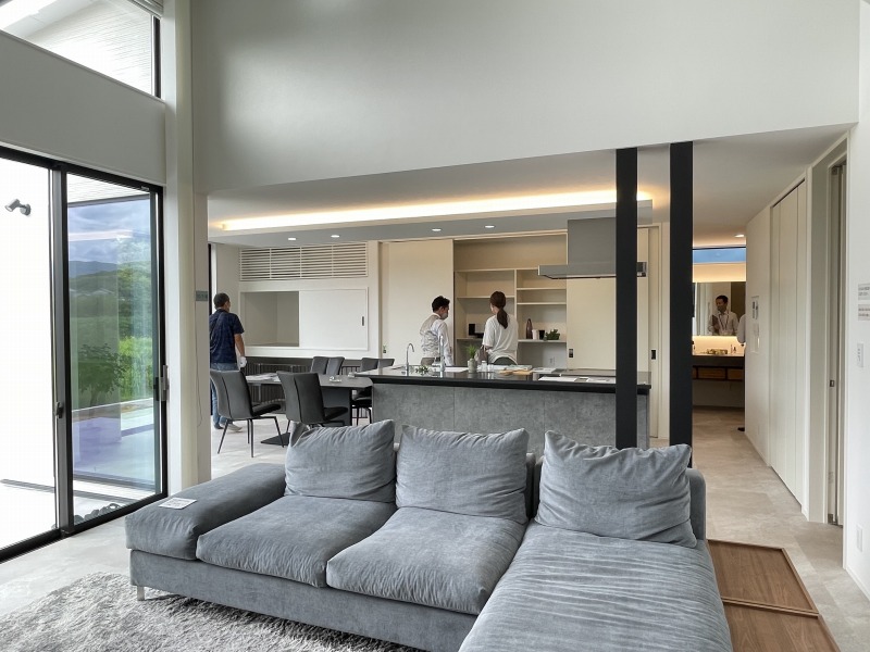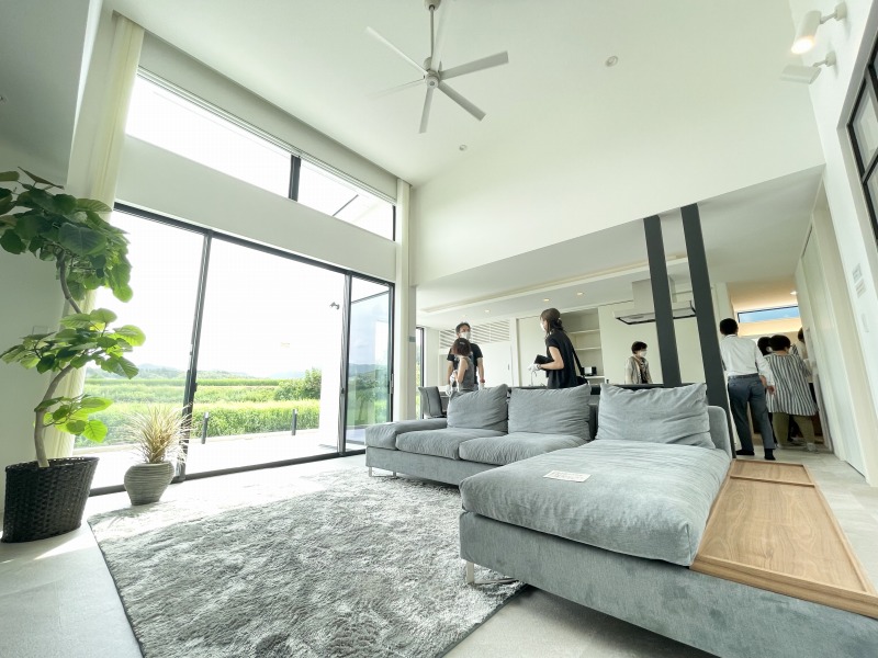 海外インテリアが似合う平屋住宅が内覧できるイベントを開催します。リビングは吹き抜けと豊かな自然を眺められる大開口の窓を設置し、明るい空間に。