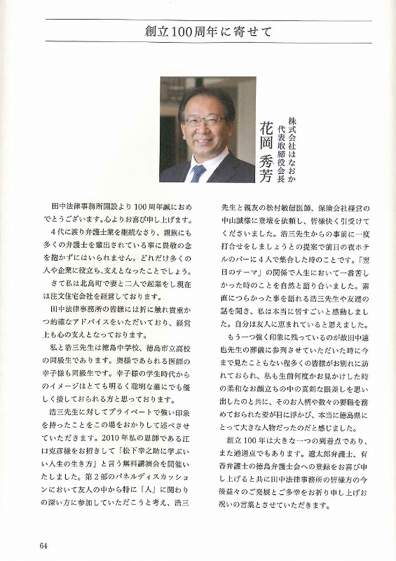 『田中法律事務所創立100周年記念誌』に寄稿文が掲載されています 2025.01.31 一般 株式会社はなおかが、折にふれてアドバイスをいただいている田中法律事務所様が創立100周年を迎えられました。 弊社の花岡秀芳の寄稿文も掲載されておりますので、ご紹介させていただきます。 share 前の記事へ 次の記事へ 一覧へもどる
