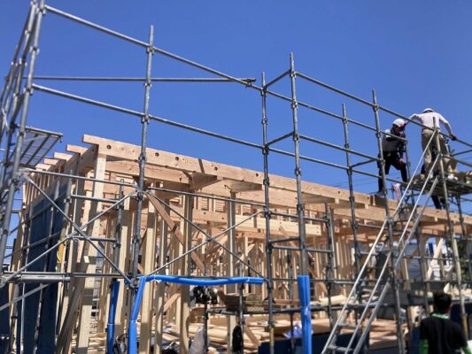 青空の下、無事棟を納めることができました。