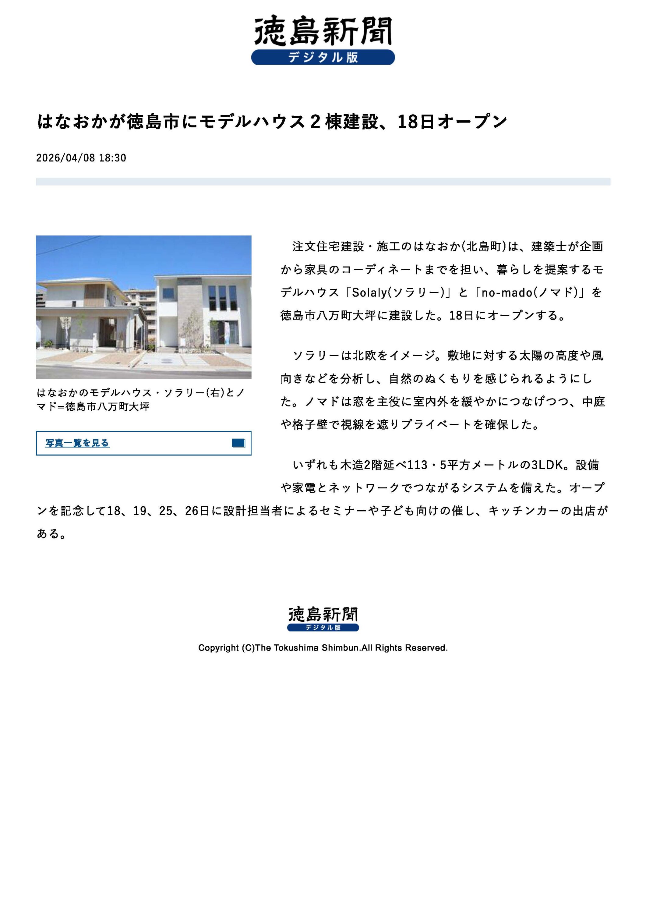 4月8日(水)、徳島新聞デジタル版に掲載されました 2026.04.09 一般 4月8日(水)、徳島新聞デジタル版に徳島市八万町大坪のモデルハウスが掲載されました。 お家の概要とオープニングイベントについて紹介していただきました。 はなおかでは、今月18日にモデルハウス『Solaly(ソラリ―)』、『no-mado(ノマド)』がグランドオープンします。 2週連続でオープニングイベントを開催します。 イベント情報についてはコチラから。 ぜひ、お気軽にご参加ください! share 前の記事へ 次の記事へ 一覧へもどる