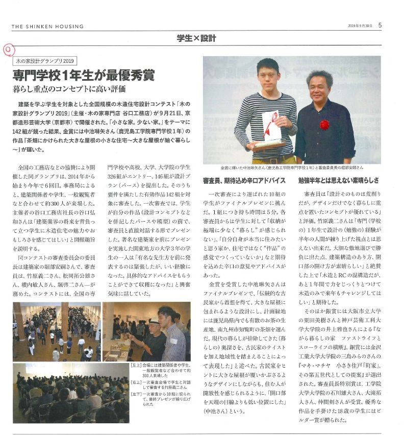 新建ハウジングに『木の家設計グランプリ2019』が掲載されています 2019.10.15 はなおかも協賛している『木の家設計グランプリ2019』が新建ハウジング9月30日号で記事になっていました。 木の家設計グランプリは、学生を対象とした木造住宅設計コンテストです。 はなおかでは4年連続でビルダー賞を贈っています。 share 前の記事へ 次の記事へ 一覧へもどる