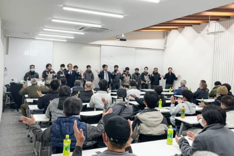 毎月開催される大工会議は、建築技術や会社としての家づくりの想いや理念を共有する大切な場所です。300回以上の回数を重ねており、はなおかの家づくりの根幹を支えています。
