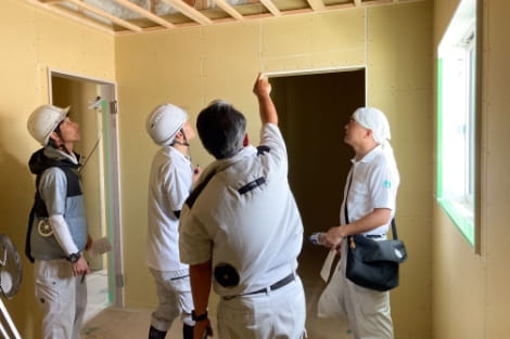 年に1度、はなおかの専属大工さんが集まって、社員と一緒に各現場を回るイベントです。大工さんと社員がおさまりについて意見を交わし、質の良い家づくりに活かしています。