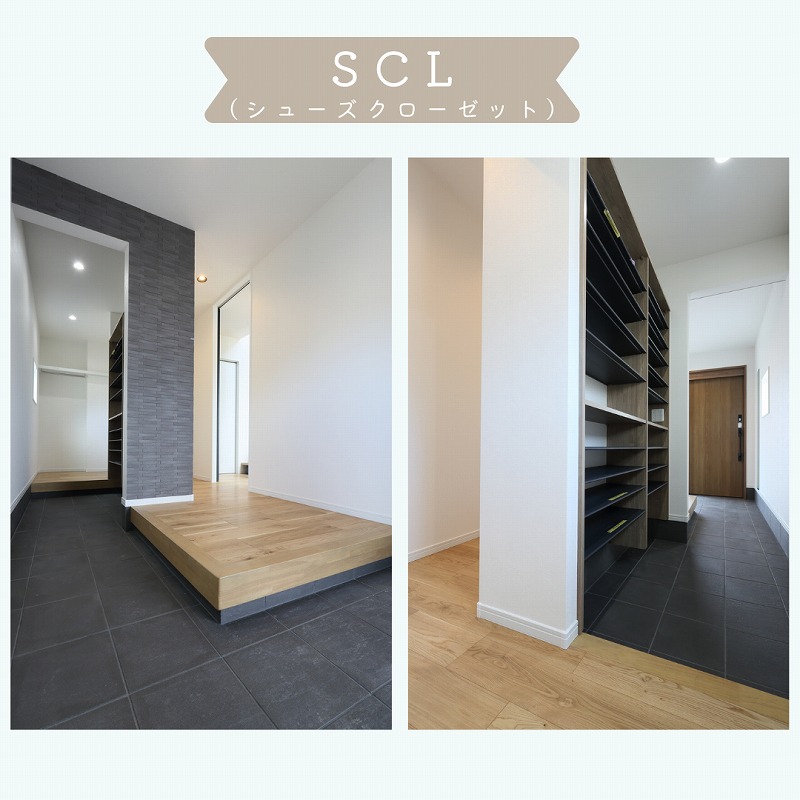 はなおかの場合、最近では90%近くの方がSCLを設けています。また、SCLからそのまま玄関土間へ通り抜けできる間取りが人気。この間取りは、“玄関→SCL→手洗い場”や“玄関→SCL→パントリー”など、生活に合わせた快適な生活動線を確保できます。玄関に何を置くか、帰宅後の動線などを考えた上で、最適な玄関収納を選びましょう。
