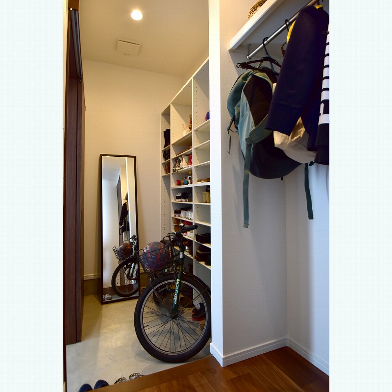 玄関の横や奥に設けられた、靴を履いた状態で出入りできる収納スペースのことです。靴の収納だけではなく、コートや傘、ゴルフバッグなども収納できます。