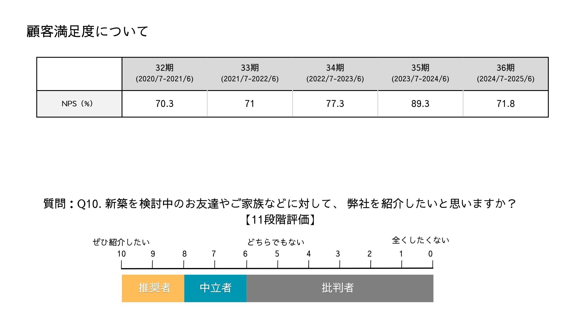 質問は「新築を検討中のお友達や新築を検討中のお友達やご家族などに対して、 弊社を紹介したいと思いますか?」という内容で、10段階で評価します。
