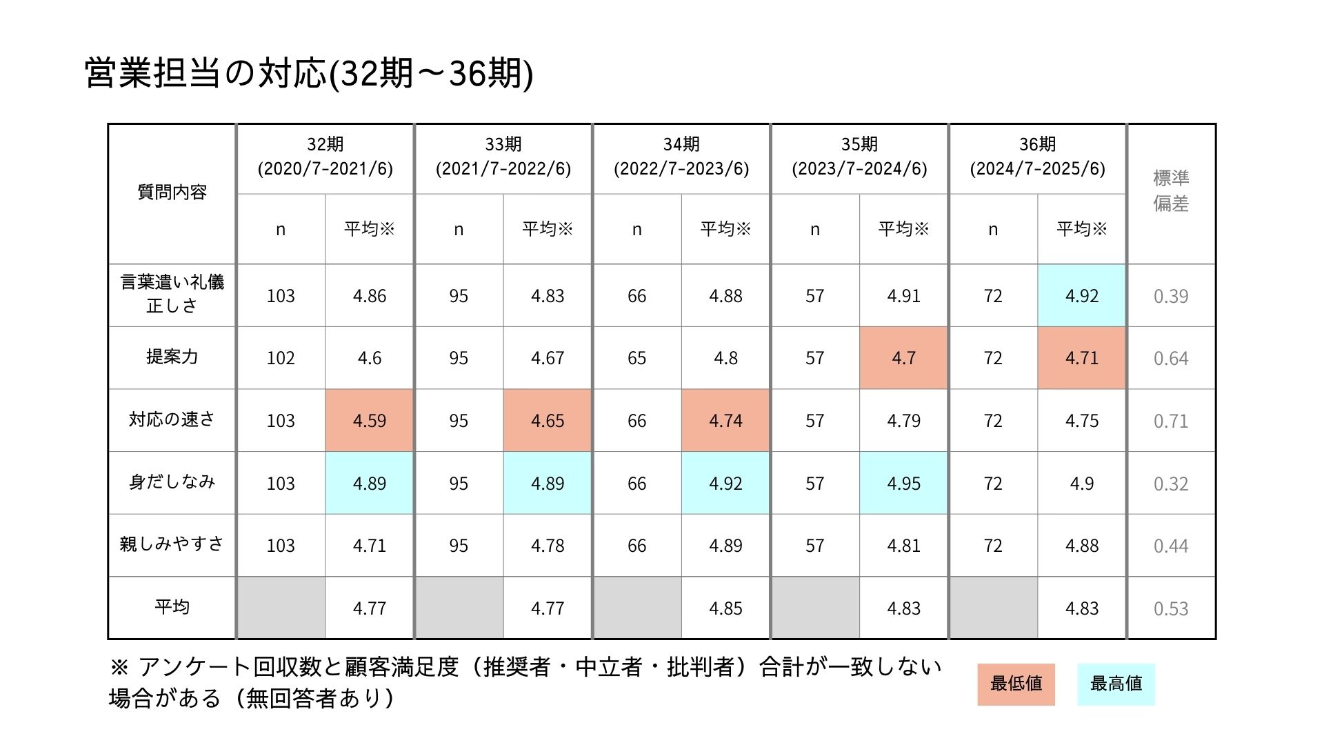 営業担当者の平均評価として「対応の速さ」が低いことが見られ、今後の反省点だと思わされました。