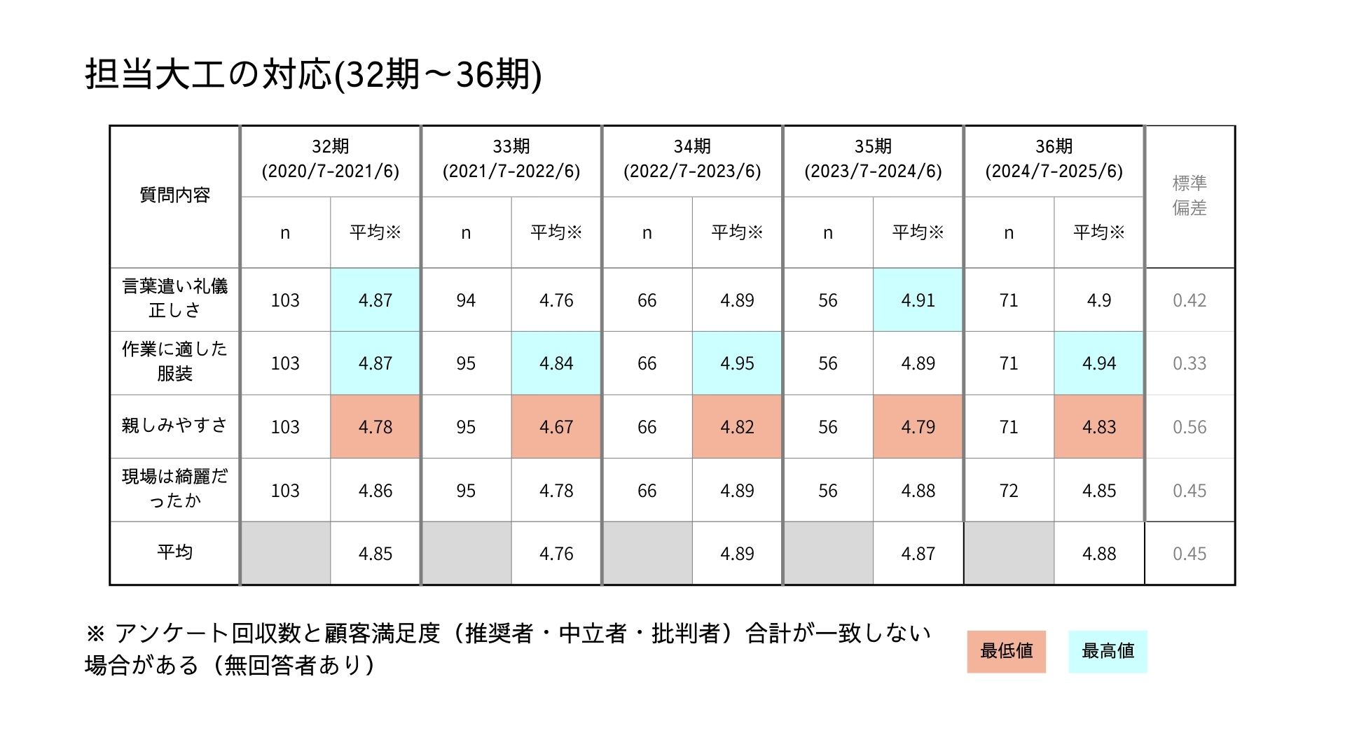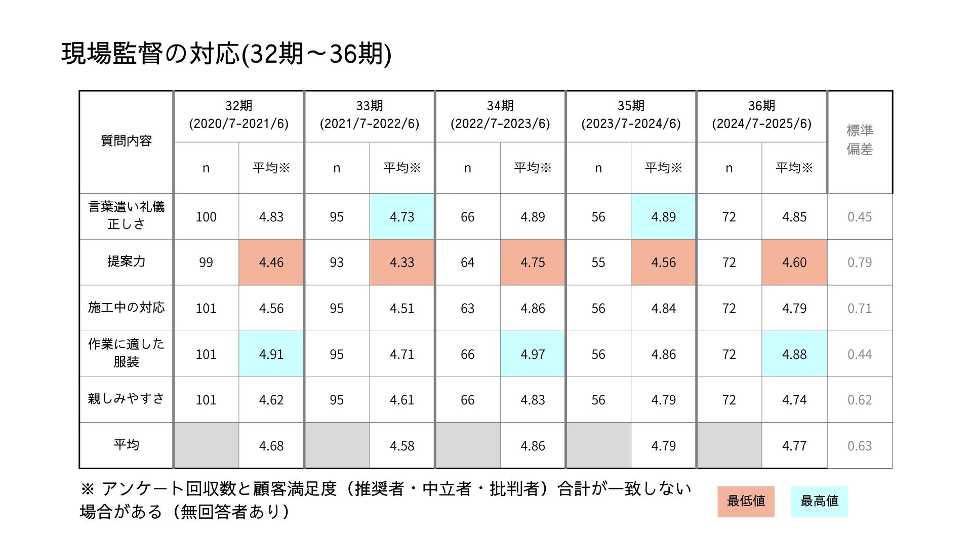 また、「提案力」の評価が低く「現場で現場監督さんと会うタイミングが少ない」というコメントも見られました。タイミングが合えばお客様とコミュニケーションを大切にし、現場でのお客様の不安や疑問の解消に努めたいと考えております。