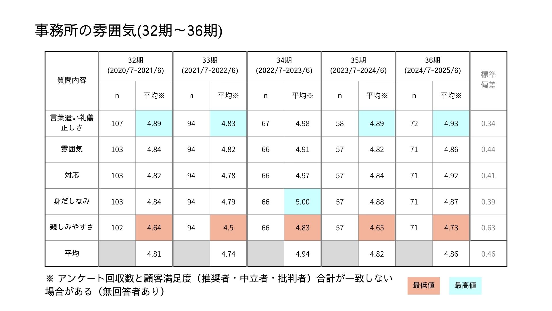 「親しみやすさ」に対しての平均評価がわずかに低く、笑顔や挨拶を意識しお客さまが居心地よく過ごせる事務所の雰囲気づくりに心掛けてまいります。