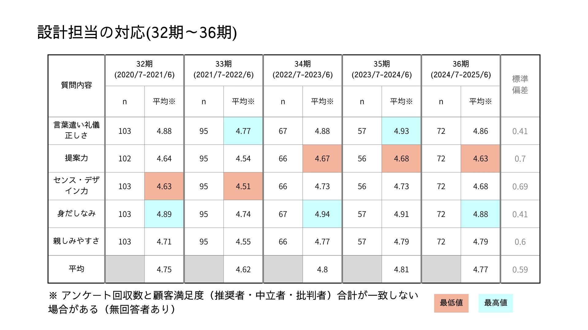 設計担当者への平均評価も、営業担当者と同様「身だしなみ」や「言葉遣い・礼儀正しさ」の評価が高いところが特徴。「提案力」や「センス・デザイン力」が少し低い部分がありますが、それでも半数以上の方から高評価をいただいています。