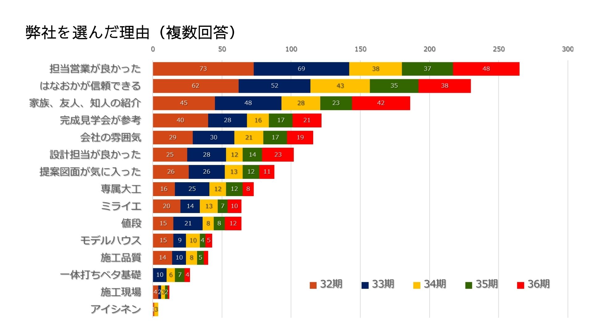 平均的に「担当営業が良かった」をはなおかを選んだ理由として挙げていただく方が多くいらっしゃいました。はなおかでは、営業担当者が出会い~お引き渡しまで家づくりの伴走者として、お客さまをサポートしていきます。その点で営業担当者を高く評価していただき、「選んだ理由」に上げていただけたと分析しています。