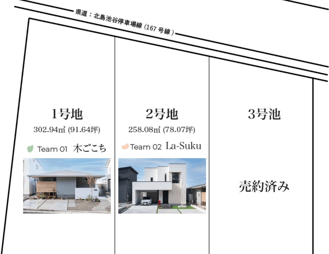 建築地は板野郡北島町高房の弊社分譲地に3区画で着工中。雑木林などがあり自然も感じられる静かな立地です。そこで、3チームそれぞれが提案する住宅が横並びに建築されます。