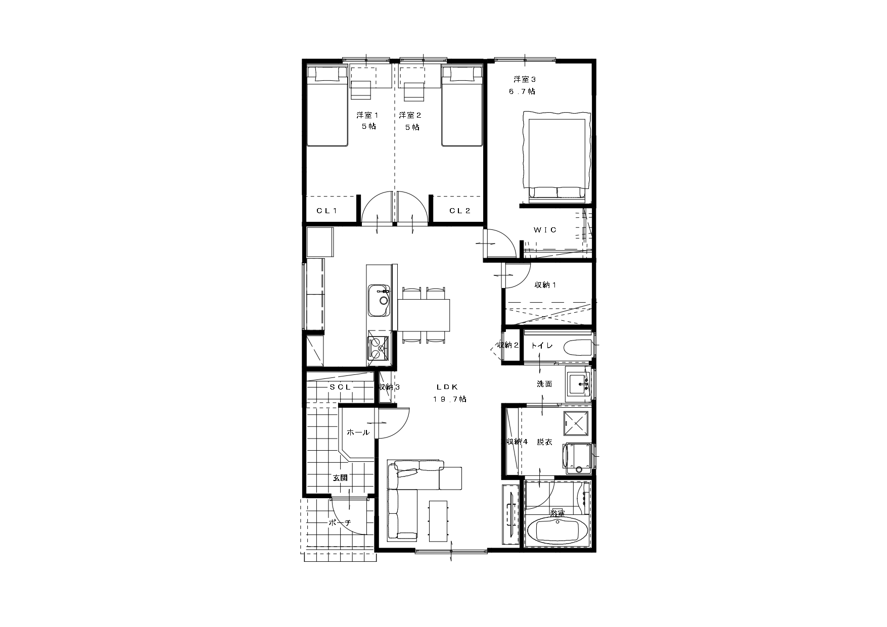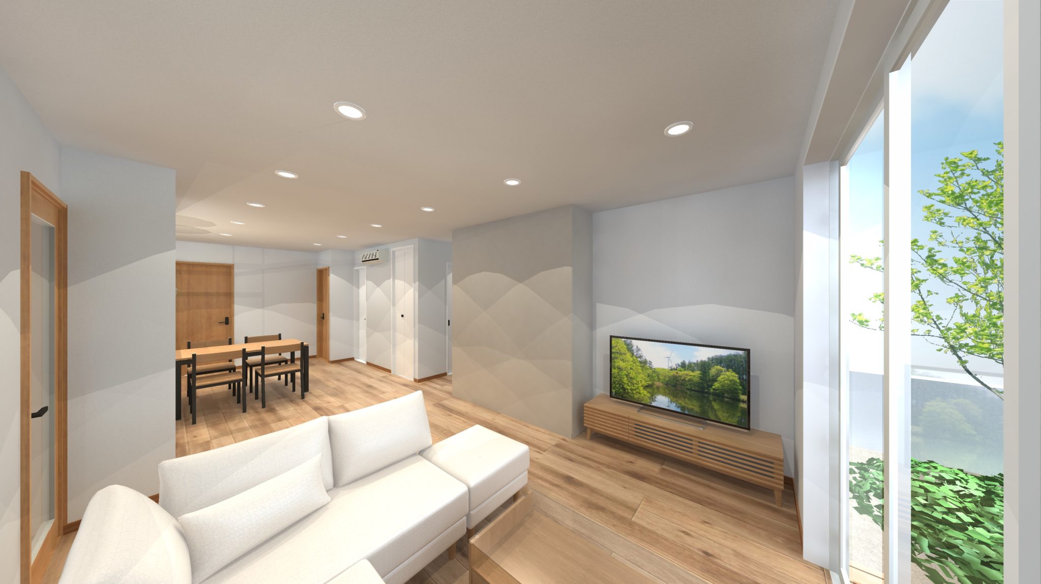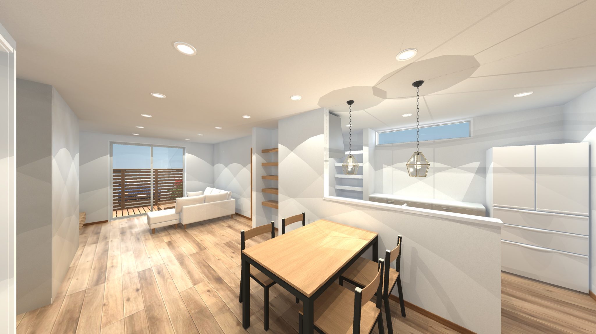 広々とした空間づくりがポイントの平屋住宅です。19.7帖のLDKは、デッキスペースとつながる解放的な空間。デッキスペースには目隠し塀をけ、プライベートなアウトドア空間として活用できます。また、コンパクトな水廻り動線やライフスタイルの変化に柔軟に対応できる間取り計画など、暮らしのアイデアもポイントです。